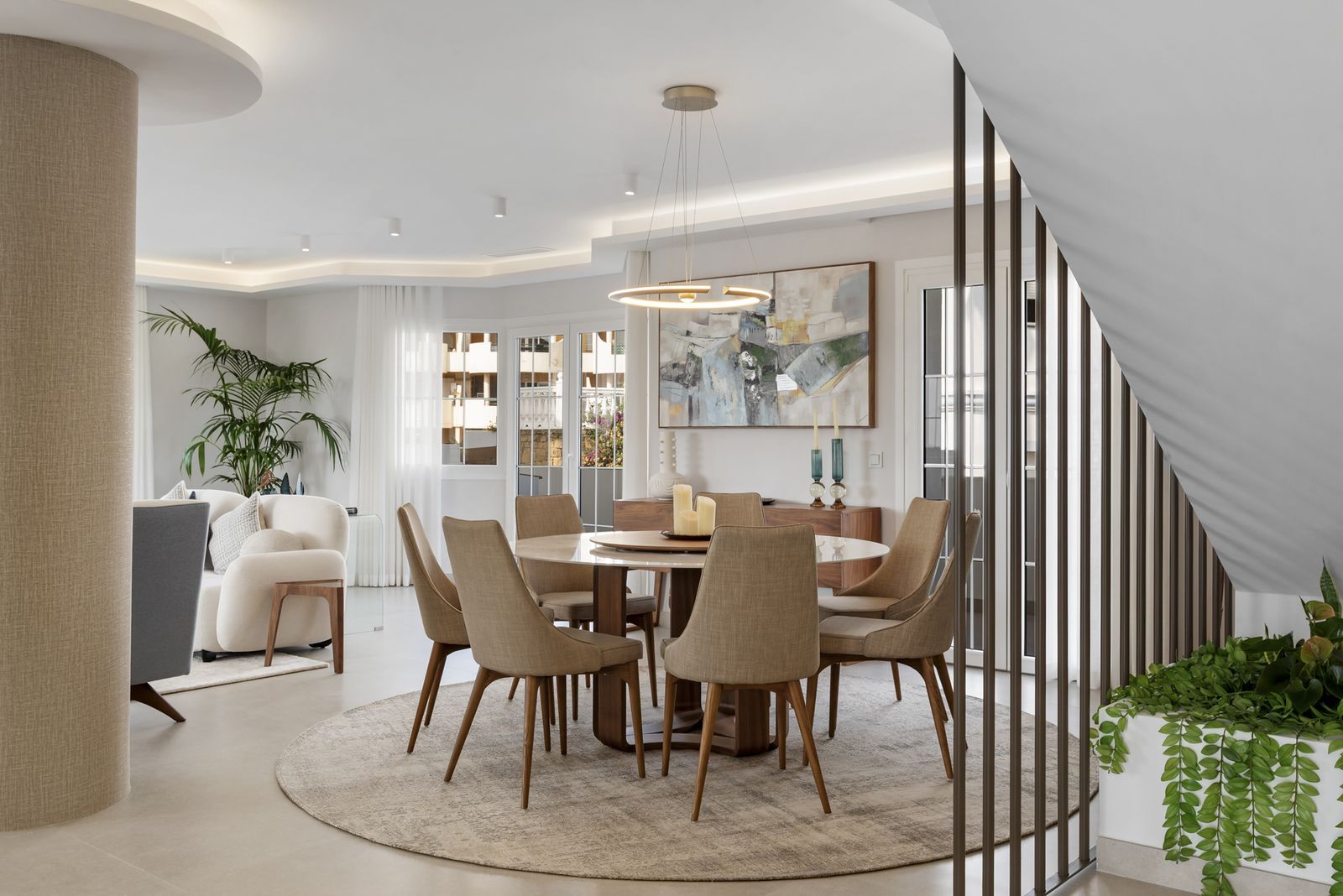 Penthouse Las Lolas is one of those rare residences that immediately conveys harmony, style, and thoughtful design. Positioned at the top of one of Nueva Andalucía’s best-located buildings, and just minutes from both Marbella Arena and Puerto Banús, this home offers a unique combination of tranquility, convenience, and breathtaking views. Here, Mediterranean living meets modern architecture in a dual-level penthouse featuring 304 m² of interior space and 100 m² of terraces, crafted to be enjoyed from morning to night.