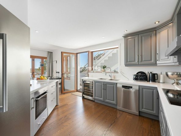 Upon entry, you'll find a guest toilet and a stunning open-plan layout that combines a sleek, fully equipped kitchen with a stylish living and dining area. From the moment you step inside, the breathtaking sea views will captivate you.