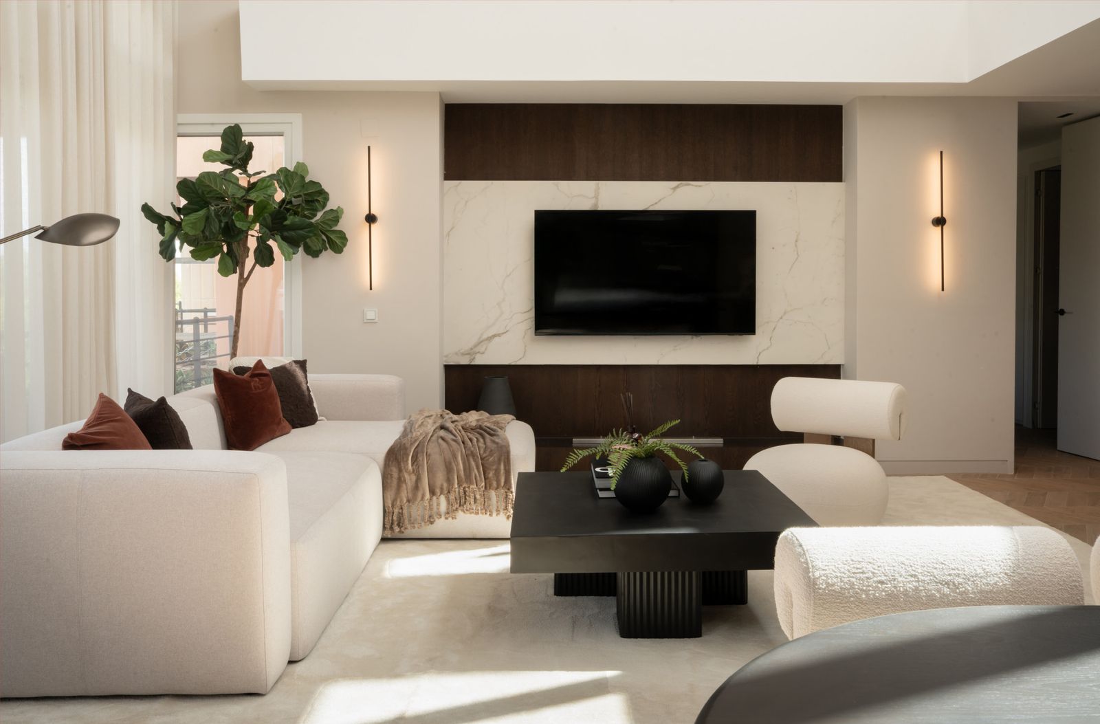 Inside, double-height ceilings and a bright open-plan layout seamlessly connect the living, dining, and kitchen areas. Every detail has been carefully updated, from the sleek finishes to the underfloor-heated bathrooms, ensuring both comfort and contemporary style. Sold fully furnished, the home is ready to move into and enjoy immediately.