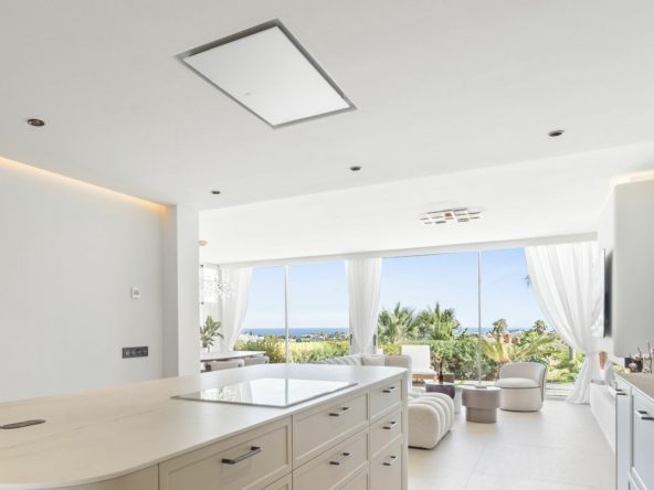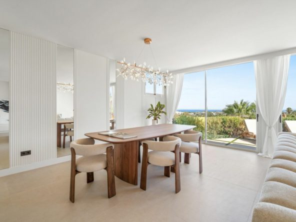 Designed with contemporary style and premium materials, the open-plan living area features a sleek kitchen with high-end appliances and natural finishes. Floor-to-ceiling doors open to a spacious south-facing terrace with panoramic views of the Mediterranean and the beautifully landscaped gardens.