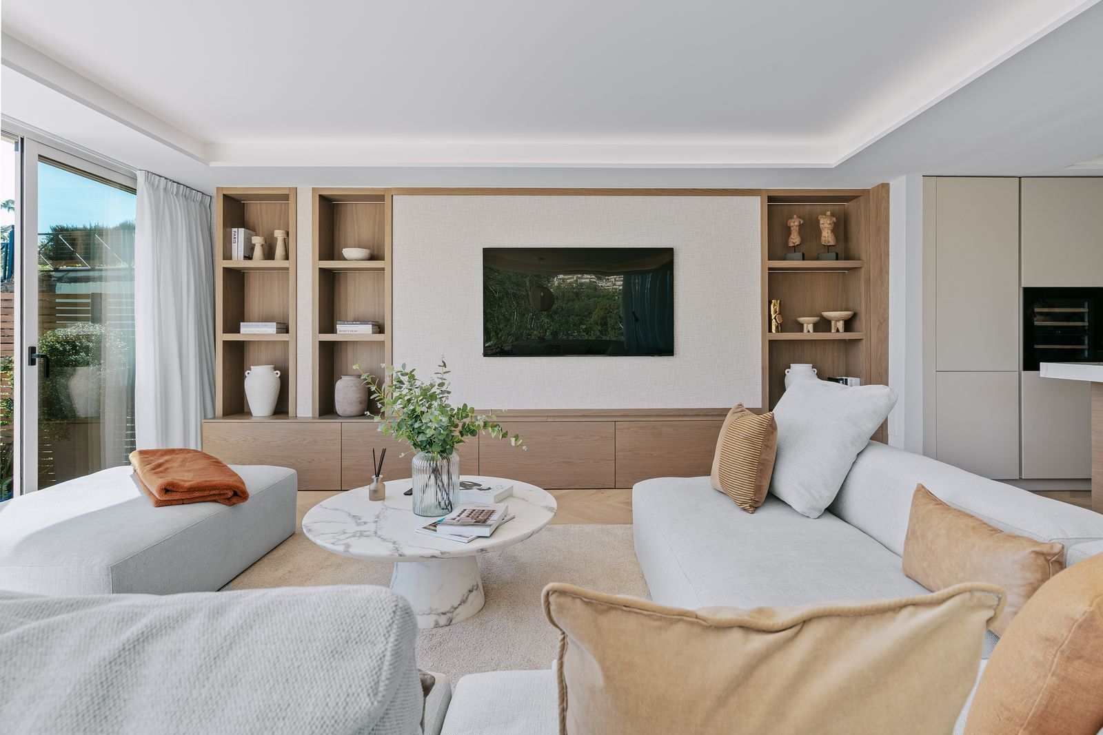 The open-plan kitchen, equipped with premium Siemens appliances, seamlessly connects to the living and dining area, creating an inviting environment for both everyday living and entertaining.