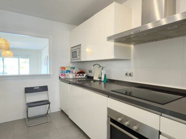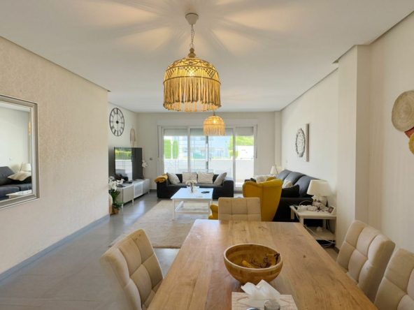 The property features 3 spacious bedrooms with fitted wardrobes, 2 full bathrooms (one en-suite with double sink and bathtub), and a bright, generous living-dining room with direct access to a large covered terrace overlooking the gardens and pool. The independent kitchen, fully equipped with high-quality appliances, combines functionality and style. The apartment also includes centralized air conditioning, an underground parking space, and a storage room.