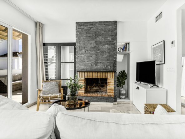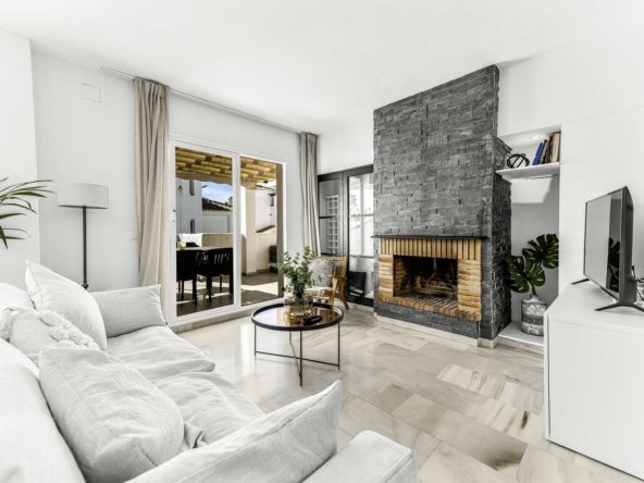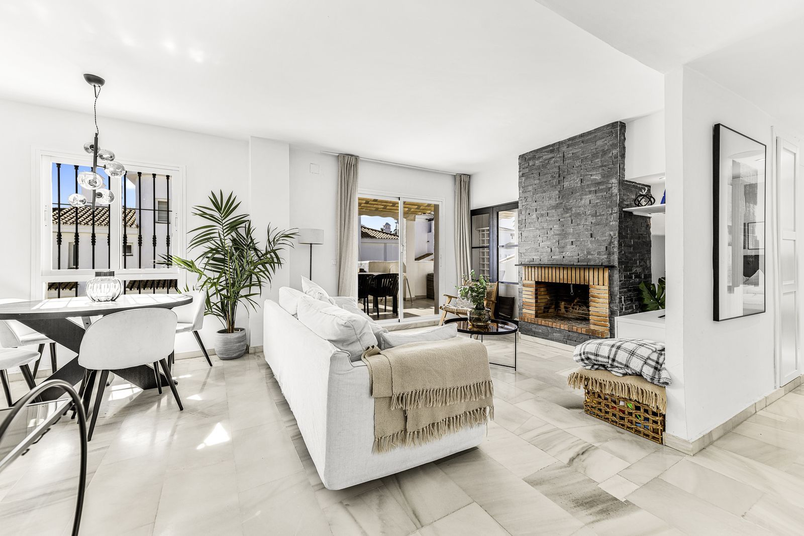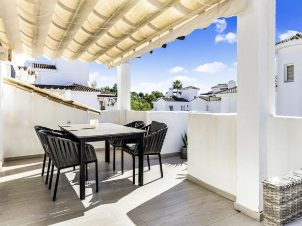 This elegant duplex penthouse in Nueva Andalucia offers three bedrooms and two bathrooms, combining modern comfort with a prime location. The spacious lower terrace is ideal for relaxing or entertaining, while the rooftop solarium with its outdoor kitchen creates the perfect setting for al fresco living under the Mediterranean sun.