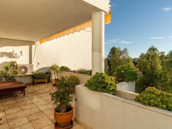 The apartment boasts three generously sized bedrooms and three bathrooms, ideal for both family living and entertaining. A newly renovated kitchen combines sleek design with outstanding functionality, while the expansive living area includes a charming fireplace and stylish marble floors. The southwest-facing orientation floods the space with natural light and offers beautiful sunsets from the large, covered terrace. Beyond the terrace are views of the Guadalmina River with its ever changing scenery.
