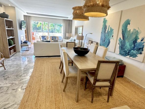 UNIQUE – BEAUTIFUL, RENOVATED AND IMPECCABLE. Spacious 4-bedroom duplex penthouse located in Alhambra del Golf, one of the most emblematic developments in Guadalmina Baja. It has spacious rooms and two terraces on both floors, totalling 70 metres. On the lower floor there is a large living/dining room with access to the semi-covered terrace, facing south and overlooking the communal gardens, beach, swimming pools and children's area of the development. It also has a fully equipped kitchen with a laundry area and two bedrooms, both with en-suite bathrooms, as well as a guest toilet. On the upper floor is the master bedroom, with high vaulted ceilings and numerous wardrobes, with its en-suite bathroom and access to a large covered terrace. On this same floor there is another bedroom with a full bathroom.