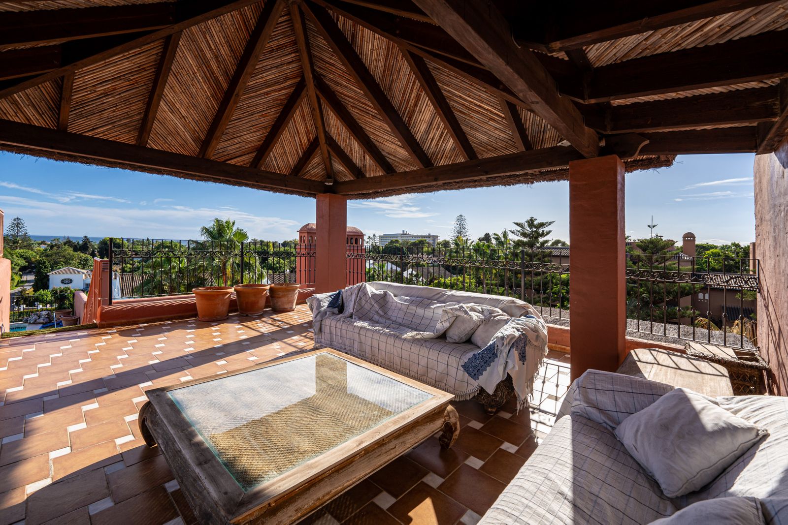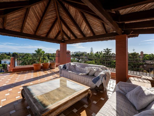 Penthouse Alhambra is a stunning duplex with private lift access in one of Guadalmina Baja’s most exclusive beachside communities. The residence features grand living areas filled with natural light from floor-to-ceiling windows and direct access to a wraparound terrace with panoramic views of the sea, gardens and mountains. High ceilings, classical details and elegant finishes create a sense of space and luxury throughout.