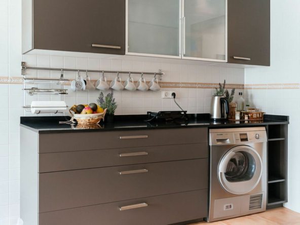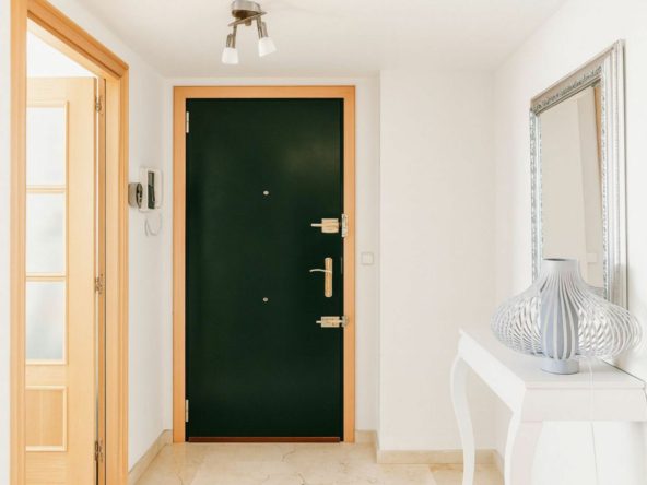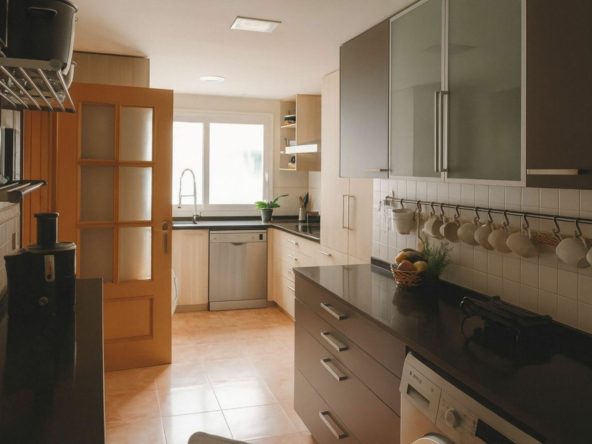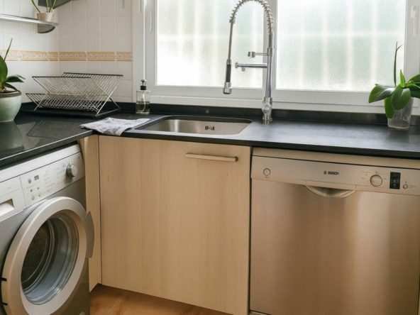 The flat has a practical layout: the kitchen is on the left, fully equipped with good quality appliances, ideal for everyday use.