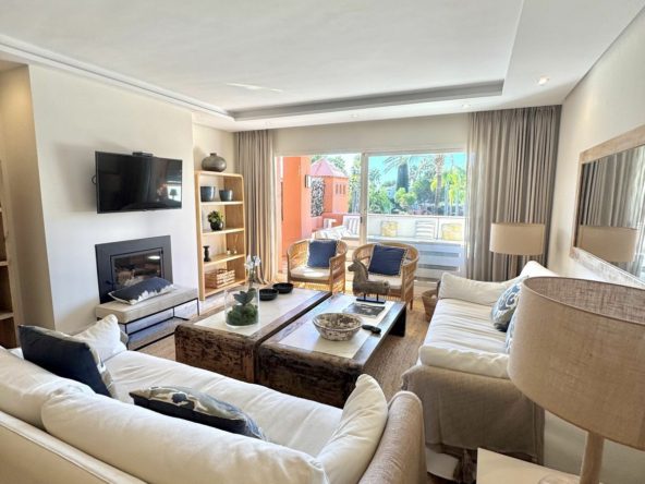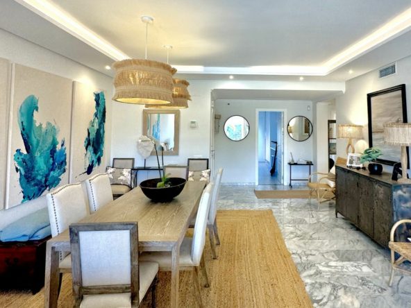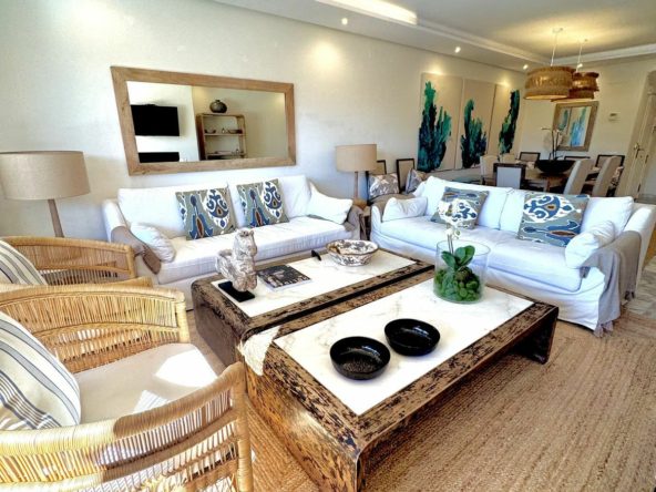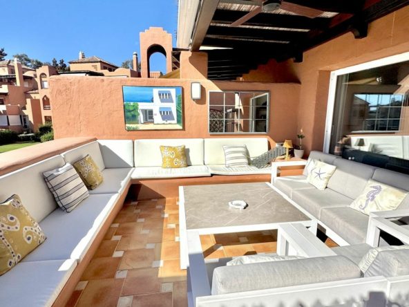 UNIQUE – BEAUTIFUL, RENOVATED AND IMPECCABLE. Spacious 4-bedroom duplex penthouse located in Alhambra del Golf, one of the most emblematic developments in Guadalmina Baja. It has spacious rooms and two terraces on both floors, totalling 70 metres. On the lower floor there is a large living/dining room with access to the semi-covered terrace, facing south and overlooking the communal gardens, beach, swimming pools and children's area of the development. It also has a fully equipped kitchen with a laundry area and two bedrooms, both with en-suite bathrooms, as well as a guest toilet. On the upper floor is the master bedroom, with high vaulted ceilings and numerous wardrobes, with its en-suite bathroom and access to a large covered terrace. On this same floor there is another bedroom with a full bathroom.