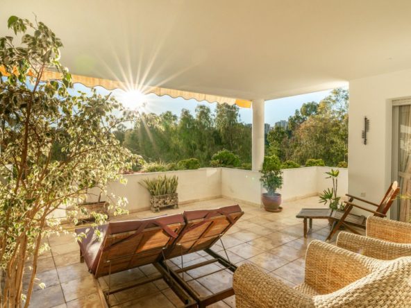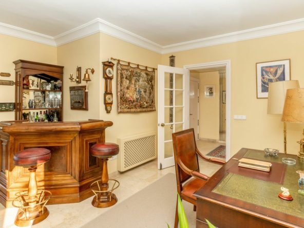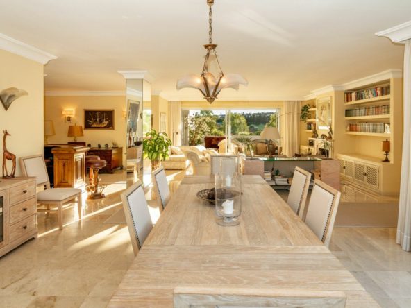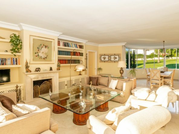 The apartment boasts three generously sized bedrooms and three bathrooms, ideal for both family living and entertaining. A newly renovated kitchen combines sleek design with outstanding functionality, while the expansive living area includes a charming fireplace and stylish marble floors. The southwest-facing orientation floods the space with natural light and offers beautiful sunsets from the large, covered terrace. Beyond the terrace are views of the Guadalmina River with its ever changing scenery.