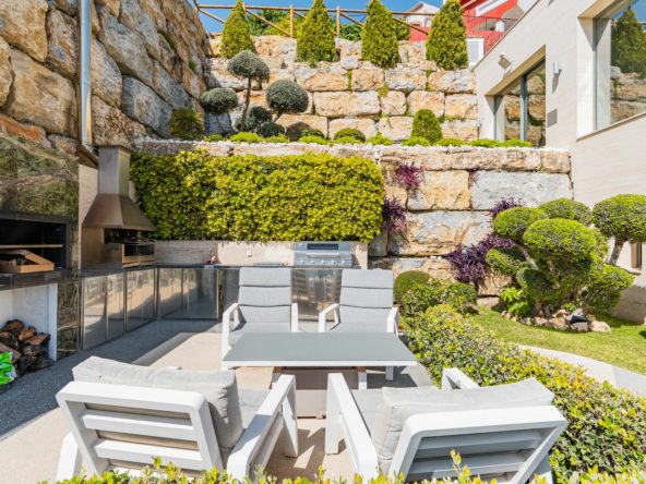 A covered outdoor dining space and fully equipped kitchen allow for effortless indoor-outdoor living throughout the year, enhanced by the villa’s south-facing orientation and panoramic views.
