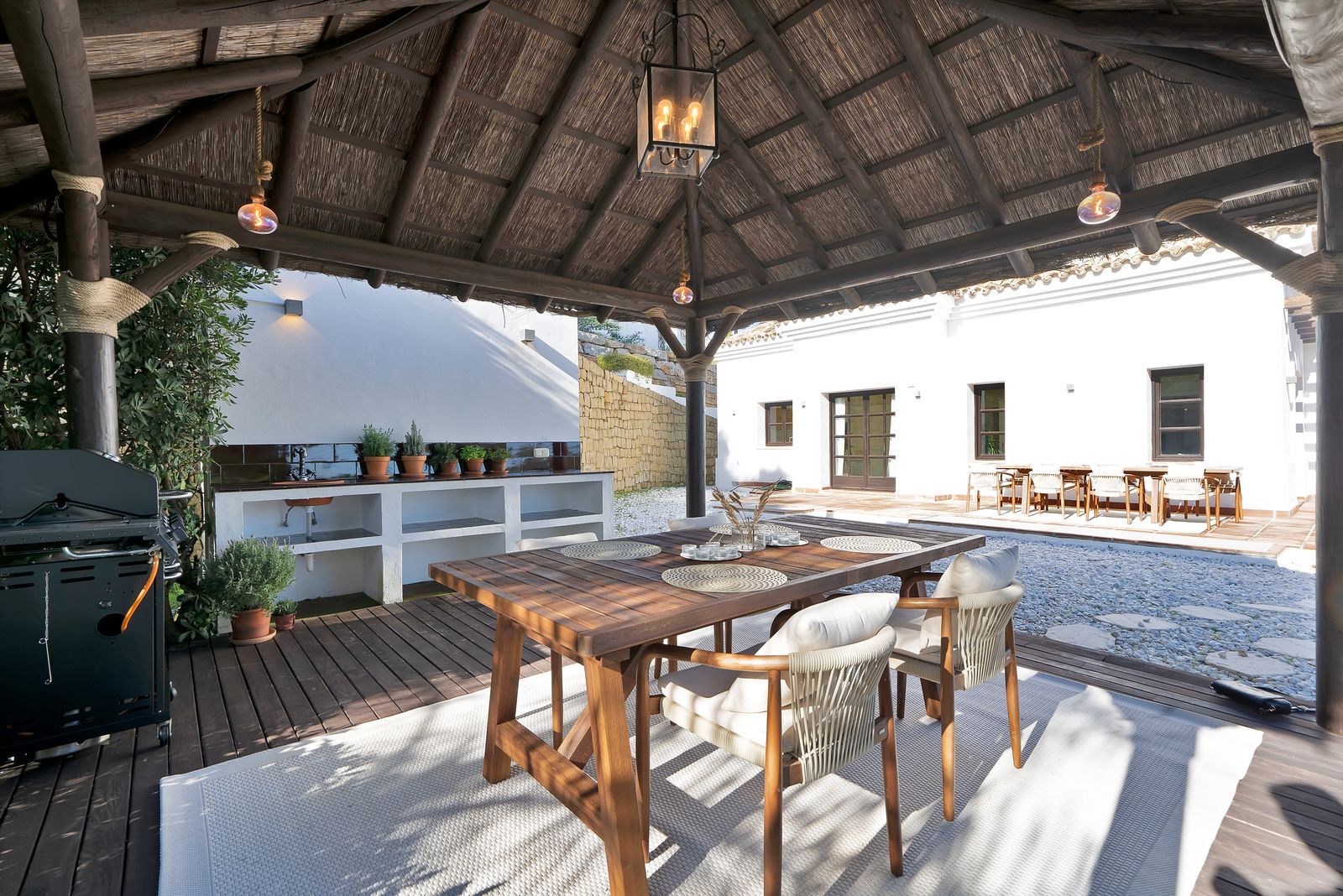 The large lounge flows effortlessly onto a covered terrace and sundrenched lawn with private pool area. The elegant living room also connects with the dining area which in turn leads to the fully fitted kitchen offering a comfortable space for both family life and entertaining. There is an open terrace off the kitchen as well as a covered gazeebo and barbecue area. All creating the perfect setting for both relaxation and entertaining.