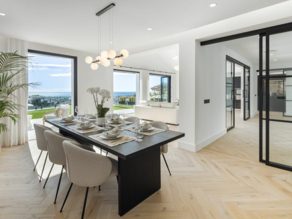 The villa perfectly blends Scandinavian oak flooring with high-end porcelain surfaces, offering a sophisticated yet warm ambiance. Outdoors, a generous green area, a barbecue zone, and a private swimming pool provide an ideal setting for entertaining and enjoying the Andalusian climate.