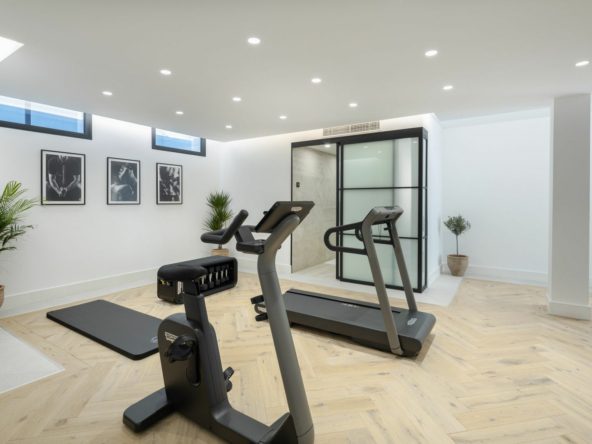The upper floor features the master suite with a large ensuite bathroom and panoramic views, accompanied by three additional ensuite bedrooms. An elegant office is ideal for working from home in comfort and privacy. On the lower level, residents can enjoy a home gym equipped with Technogym equipment.