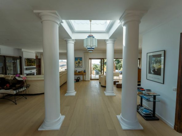 The ground floor: entrance hall with lift, guest toilet, technical installations room, spacious living/dining room with large open plan fully fitted kitchen with Bosch appliances and separate pantry, furthermore there is on this floor a separate bedroom/study with en-suite bathroom, large, covered terraces overlooking the large 51,50 m2 heated swimming pool.