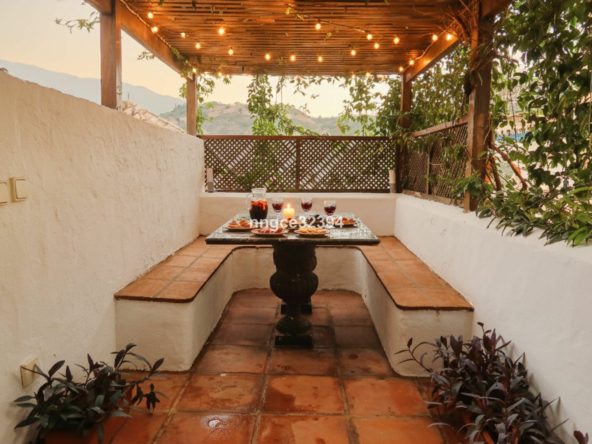 Arranged over multiple levels, the house unfolds with a natural sense of flow and privacy. The main living areas feature traditional terracotta floors, classic proportions, and a welcoming atmosphere that reflects the soul of an authentic Andalusian home. A vine-covered terrace provides an intimate setting for outdoor dining and relaxed evenings, while the rooftop solarium offers open village and mountain views — ideal for sunset drinks or quiet mornings.