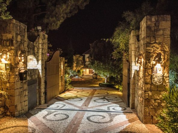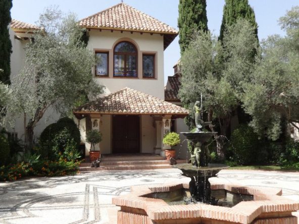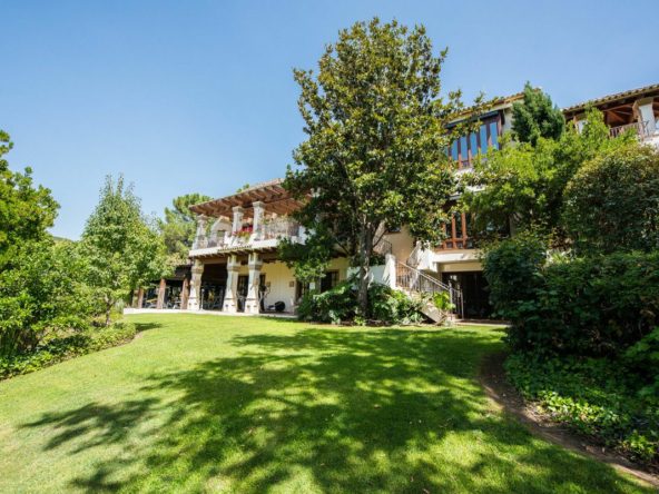 The main house, a splendid Spanish villa, climbs behind the pompous natural stone-built driveway with fountains. Master Bedroom with luxurious marble bathroom and terrace with distant views, 4 further bedrooms with terraces and marble bathrooms and 2 children's rooms with shared bathroom. Spacious living spaces with charming and cosy furnishings completes the Spanish flair. In total, the house also has 6 terraces, kitchen, 2 garages for 4 cars, a spacious and fully equipped fitness center and a beautiful pool landscape with 2 differently tempered pools and a whirlpool. The beautiful green garden leads to a built in the hillside glass studio / yoga / meditation house and a children's playground.