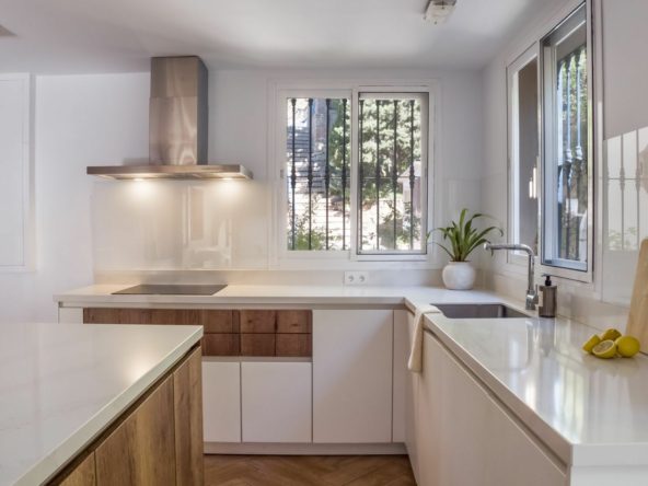 The main level features a welcoming living room with a striking double-height beamed ceiling, fireplace and direct access to a bright south-facing terrace. A separate dining room, cosy TV room, guest toilet and an enclosed terrace—perfect for year-round use—enhance the functionality of the home. The fully renovated kitchen, along with the recently updated ground floor, brings a fresh contemporary touch to the property.
