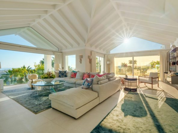 A south-facing villa in Puerto del Almendro, Benahavís with nine bedrooms and nine en-suite bathrooms, arranged across a main residence and an independent guest house on a 7,881 m² plot, offering approximately 1,177 m² of built space, 140 m² of terraces, two outdoor swimming pools, and far-reaching sea and mountain views across the Mediterranean coastline.