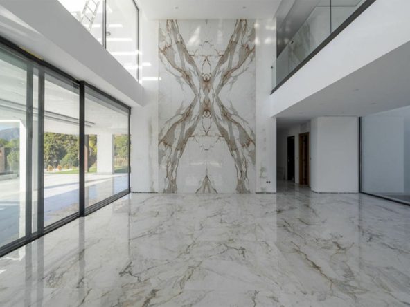 The entrance level welcomes you with a spacious living room adorned with a stunning fireplace, complemented by book-matched marble. The open-plan layout seamlessly connects to the Gaggenau-equipped kitchen. Both areas have access to the terrace through pocket Schuco doors, providing panoramic views of the Mediterranean Sea, Gibraltar, and the Moroccan coastline on clear days. Additionally, this level features a small swimming pool separate from the main pool and garden.