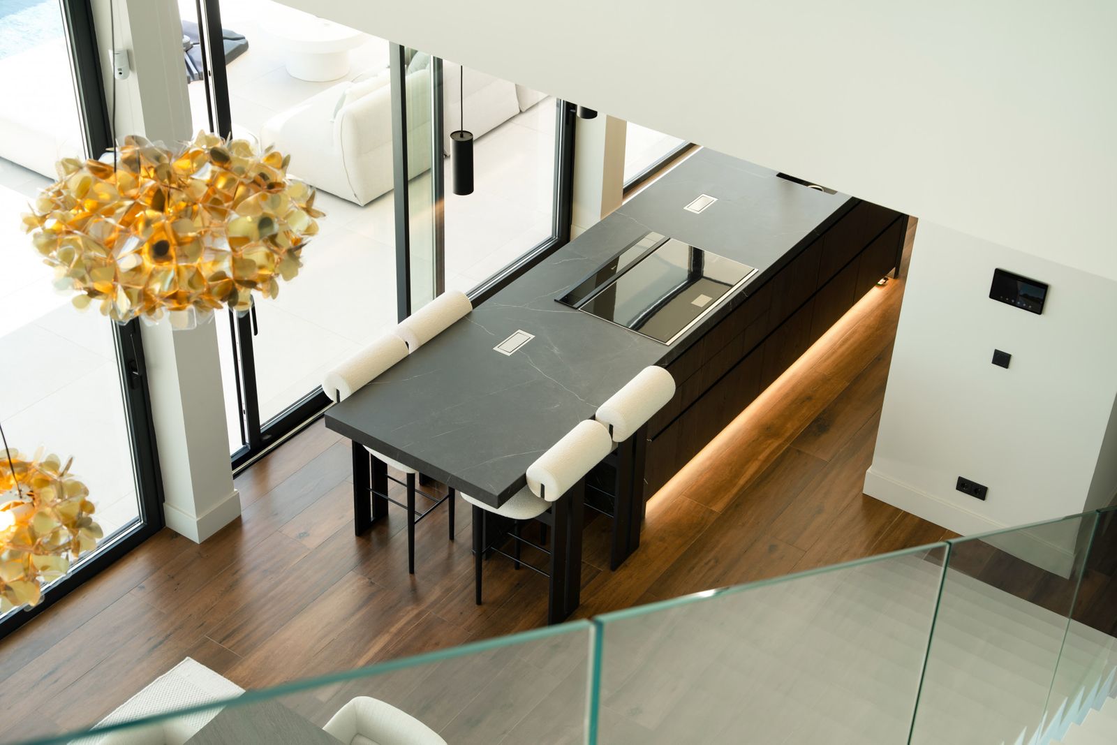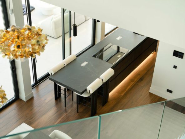 The open-plan layout is enhanced by top-quality materials, smart home technology, individual air conditioning/heating, and a private elevator connecting all floors.