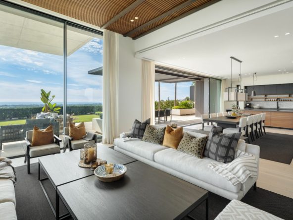 The villa is set in a prime location, offering convenience and access to world-class amenities, including renowned golf courses. The open-plan living room seamlessly connects with the dining area, creating an ideal space for both family gatherings and elegant entertaining. Large glass doors flood the interiors with natural light, enhancing the villa's bright, airy atmosphere.