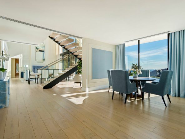 Set within a gated and secure community, the house is designed for someone who values privacy yet expects convenience. The layout is clear and deliberate. Private quarters sit above, social spaces unfold at garden level. The master suite occupies its own domain with dressing room and library. A place to retreat at the end of the day, or to start it quietly. On the ground floor, the living areas balance formal and informal use without excess. How often do you find a home that allows proper entertaining while still feeling comfortable on an ordinary weekday? Large openings draw you out towards the infinity pool and terraces, where the panoramic views remain uninterrupted.