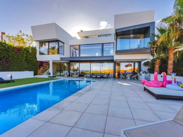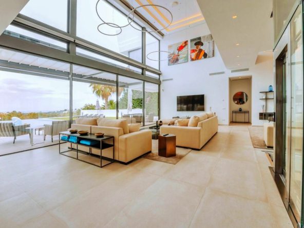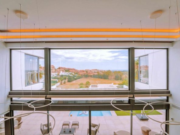 Nestled in a prime location, this exceptional property embodies modern luxury, harmoniously blending with the unique topography of its 1,439 m² plot. The villa's privileged position on the hillside offers breathtaking views of the lush golf courses in the valley, the majestic Andalusian mountains, and the sparkling Mediterranean Sea, extending all the way to the African coast and Gibraltar. Simply stunning!