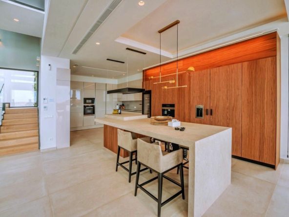 For leisure and relaxation, the property offers a professional gym, a custom-made cinema, and a full bar equipped with all the essentials, including an ice maker, dishwasher, oven, and sink. The outdoor spaces are equally impressive, with a full outdoor kitchen and island, an infinity pool that seems to merge with the sky and sea, and a 668 m² terrace where you can watch the famous Mediterranean sunset.
