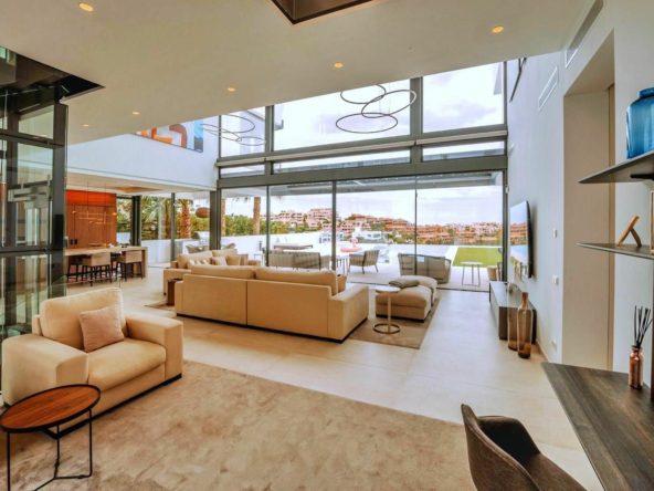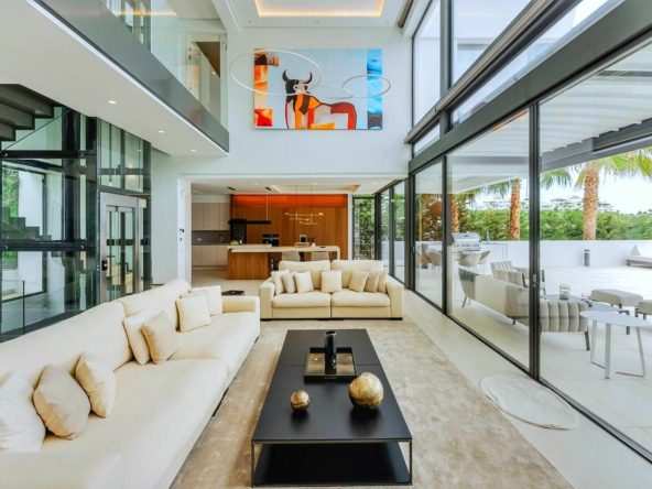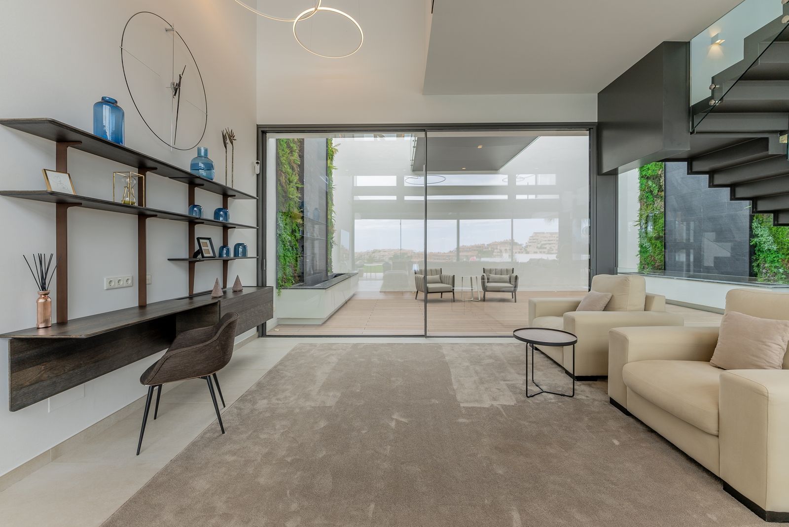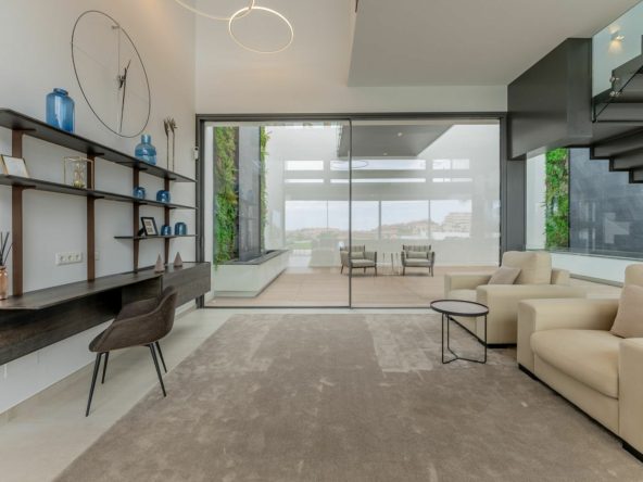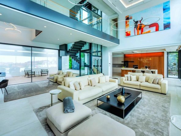 The moment you step into this ultra-comfortable, eco-friendly home, you are captivated by the open views to the golf course and the sea and transported into a realm of unparalleled modern luxury that stimulates the senses and sparks limitless creativity. The villa captivates with its exquisite architectural details, open-plan spaces with high ceilings, and expansive glass walls. The refined color palette, featuring shades of grey alongside a timeless black-and-white duo, exudes an elegant, stylish, and ever-fashionable ambiance.