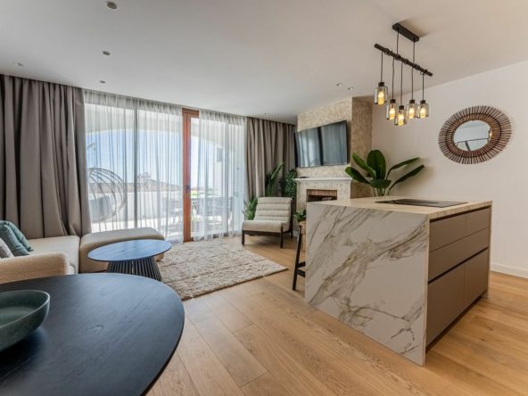The property offers three spacious bedrooms and three bathrooms, each with stunning views. Additional highlights include a private garage with rear storage, a fully fitted kitchen equipped with Siemens appliances, elegant oak flooring, air conditioning, and even a jacuzzi on the upper terrace for the ultimate relaxation.
