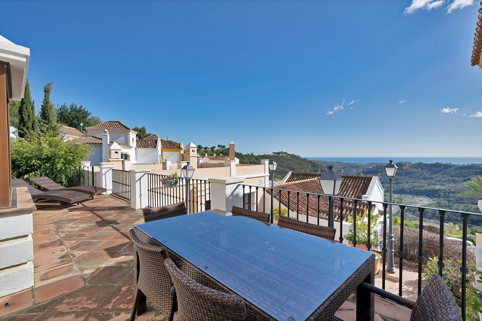 Set within a gated community with 24-hour security, the property enjoys a privileged elevated position, capturing panoramic sea views from both the spacious lounge and the main terrace. Large windows flood the interior with natural light, seamlessly connecting indoor and outdoor living.
