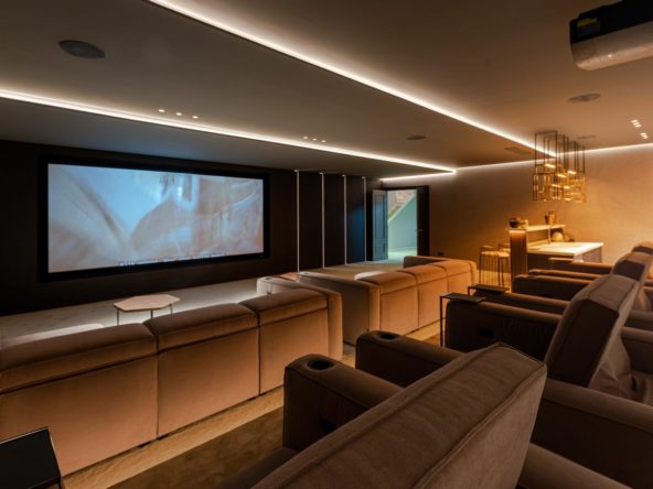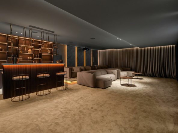 The lower floor offers an extraordinary luxury cinema room, a chic bar perfect for entertaining, a fully equipped Eleiko gym, a rejuvenating sauna, a private office for ultimate productivity, two additional guest bedrooms with en-suite bathrooms, and an expansive garage offering space for five cars, all designed with the finest attention to detail.