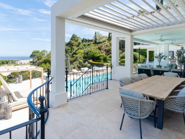 The interior of the home is equally impressive, with the main living room showcasing vaulted ceilings that create a sense of grandeur. A spacious dining area and a second living room provide ideal spaces for both formal and casual gatherings. The kitchen is equipped with high-end Gaggenau appliances, ideal for culinary enthusiasts. Stepping outside, the villa opens to an expansive terrace with a stylish lounge area, seamlessly connecting to the heated swimming pool. The south-facing orientation ensures an abundance of natural light throughout the day. This stunning villa also features a beautiful barbecue area, perfect for outdoor dining and entertaining while enjoying the spectacular views.