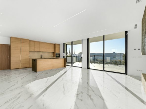 The villa is designed with modern living in mind, featuring a fully fitted kitchen, air conditioning, underfloor heating throughout, and a smart home system. The spacious interior of 912m² is complemented by porcelain floors, double glazing, and a fireplace, ensuring a comfortable environment year-round. The property also benefits from a Jacuzzi, a guest toilet, a laundry room, and ample storage space. For added security and convenience, there are surveillance cameras, a video entrance, and an automatic irrigation system for the garden.