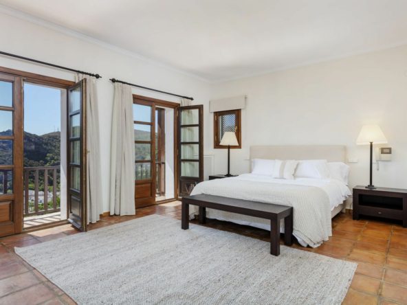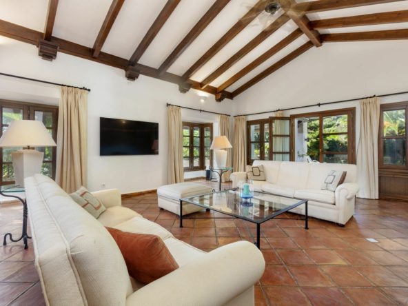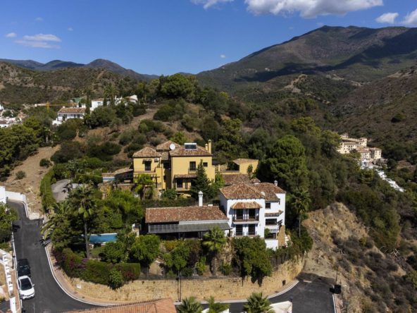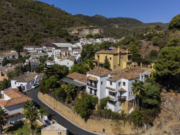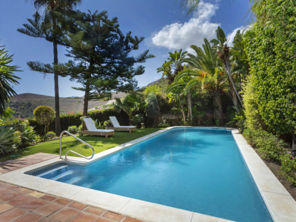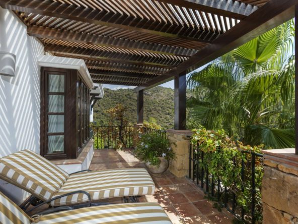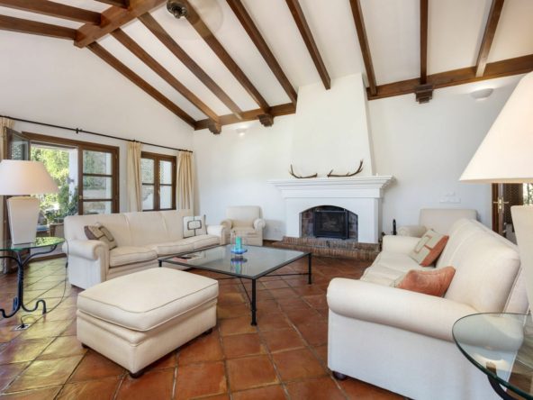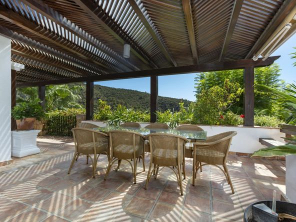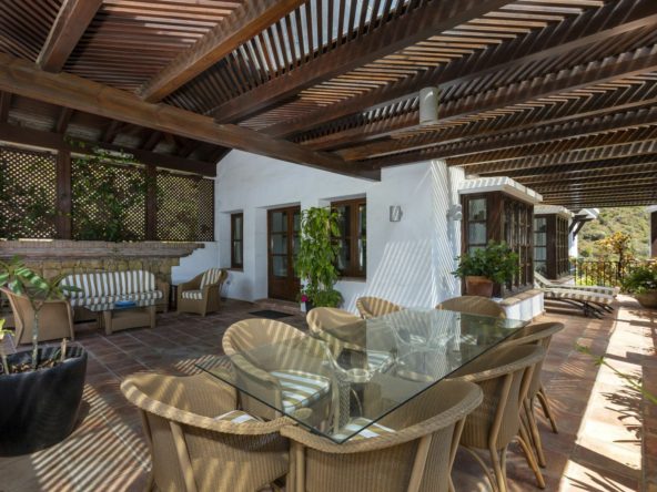Electric gates lead you into the driveway which has parking for several cars and also a double garage. There is a utility room plus large kitchen that opens up into the breakfast room. huge dining room which leads into the impressive sitting room with high beamed ceilings and cosy fireplace – perfect for winter evenings. Opening up from the sitting room is a huge terrace and garden area with large pool which is heated – Ideal for all lovers of swimming on a winters day! The garden offers total privacy and total panoramic views accross the valley and village and to the protected forest areas and super exclusive La Zagaleta.