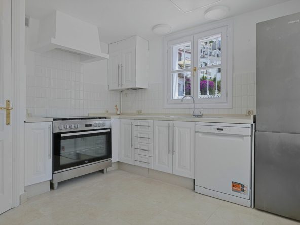 The ground floor features a welcoming living and dining area with a fireplace, creating a cozy and inviting atmosphere. This space opens onto a private terrace, perfect for outdoor dining or relaxing in the sun. The fully fitted kitchen is both functional and well-designed, complemented by a separate laundry area and a convenient guest toilet.
