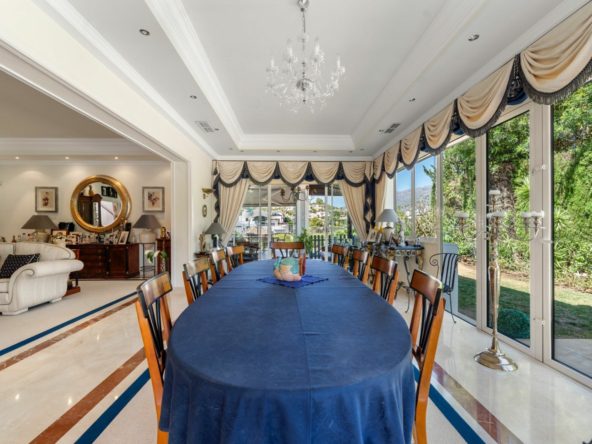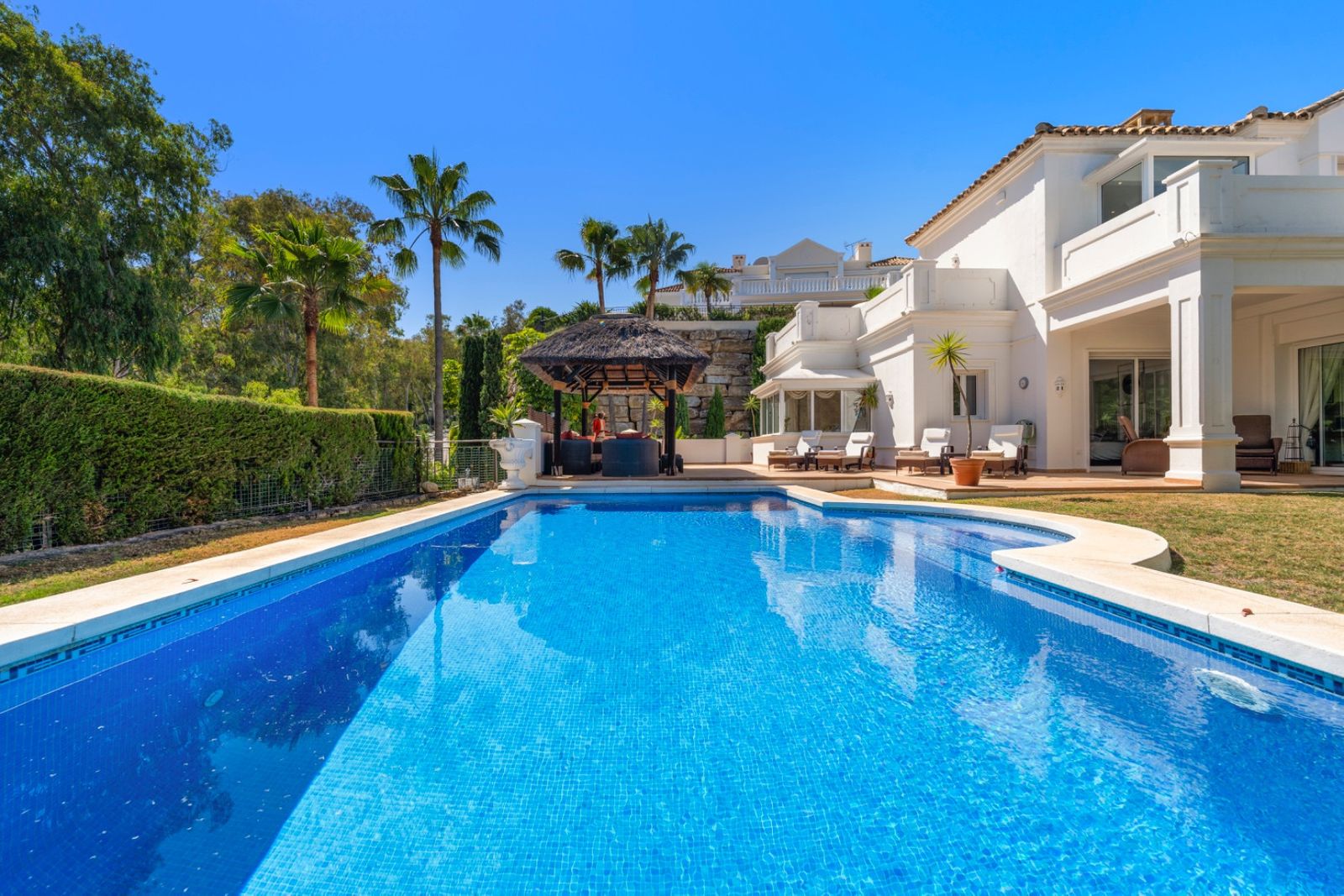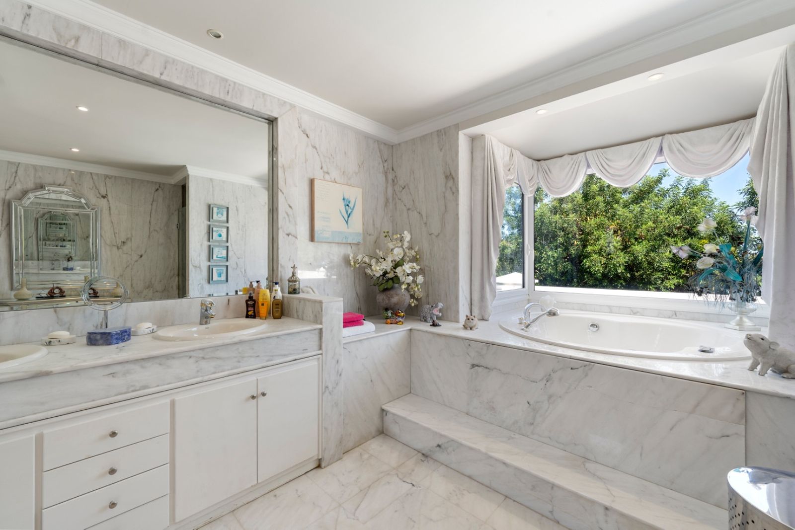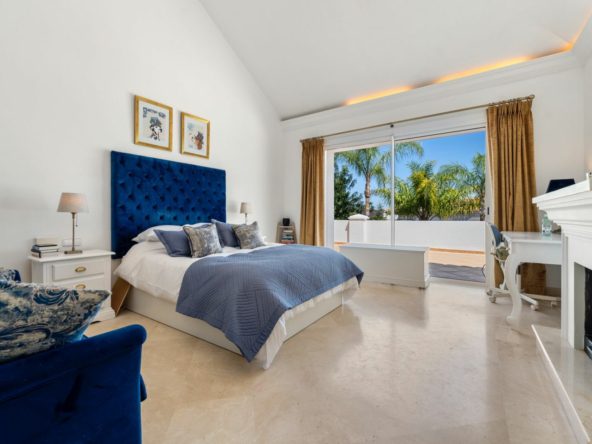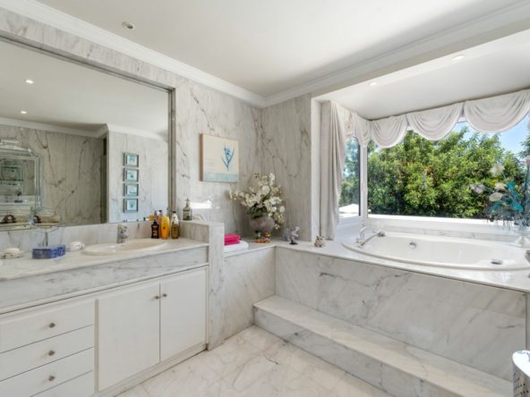 Villa Alto sits proudly within one of the coast’s most exclusive gated communities, surrounded by a world-class golf course and protected by 24-hour security. This elegant five-bedroom villa combines privacy, space, and style across three levels, offering panoramic views of La Concha mountain and the lush golf valley.