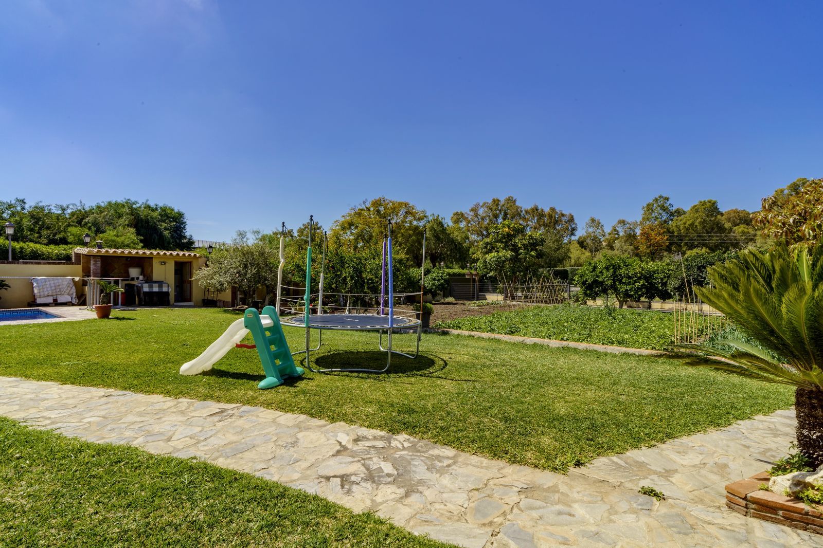 The property sits on a generous plot of 1,515 square meters, which includes a beautiful garden, an outdoor relaxation area with a large, fully equipped barbecue area and a magnificent swimming pool, equipped with a shower and separate bathroom, perfect for cooling off on warm summer days.