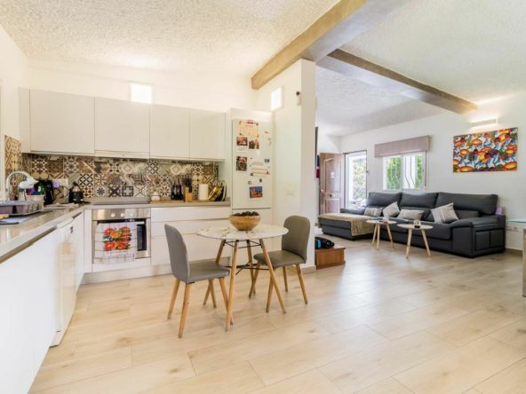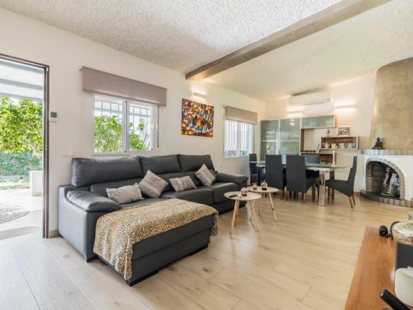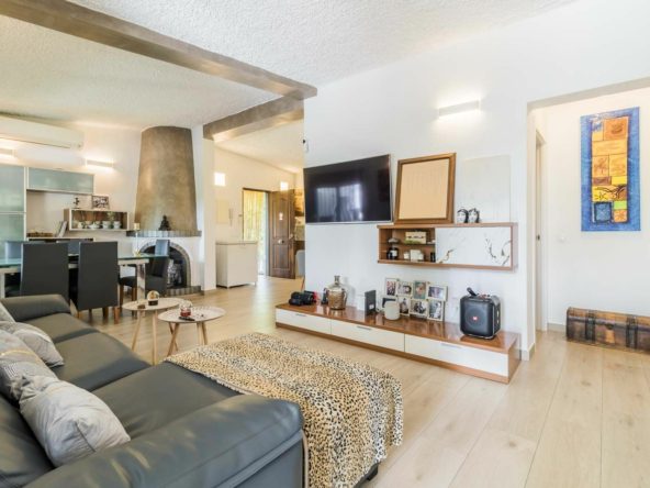 The property sits on a spacious 2,800 m² rectangular plot, offering privacy and a wide range of possibilities. The house, measuring 90 m², has been recently renovated and comprises two double bedrooms, one full bathroom inside the house and a second bathroom with independent access from the terrace, ideal for use by the pool area or for guests. It also features a bright living-dining room with a fireplace and air conditioning, seamlessly connected to a fully equipped open-plan kitchen.