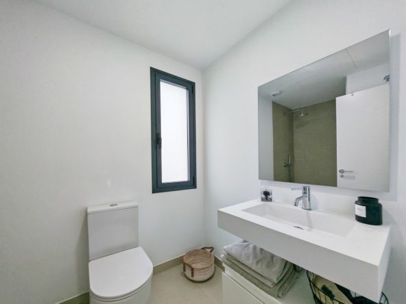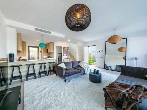 Semi Detached Villa for sale in , Estepona with 3 bedrooms, 2 bathrooms, 1 on suite bathroom, 1 toilet and with orientation south/west, with communal swimming pool, private garage (1 parking spaces) and private garden. Regarding property dimensions, it has 123.65 m² built, 206.84 m² plot, 101.45 m² interior and 44 m² terrace. Has the following facilities transport near, air conditioning, fully fitted kitchen, guest room, security entrance, double glazing, video entrance, brand new, guest toilet, private terrace, living room, country view, mountain view, underfloor heating (throughout), security shutters, covered terrace, electric blinds, fitted wardrobes, garden view, close to children playground, close to golf, uncovered terrace, glass doors, open plan kitchen, balcony, optional furniture, ceiling cooling system, close to shops, close to schools, inside golf resort and pets allowed.
