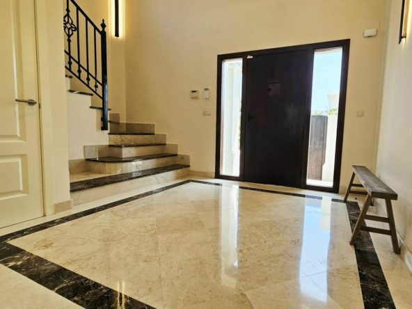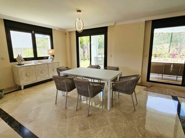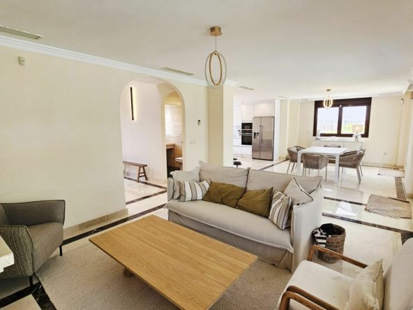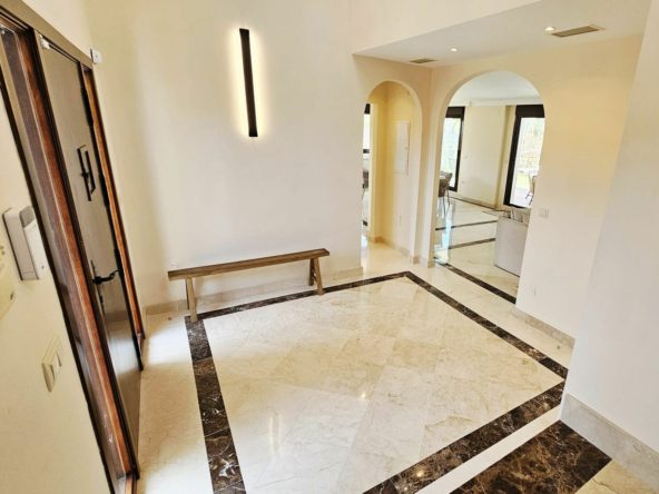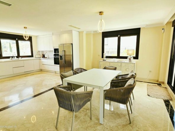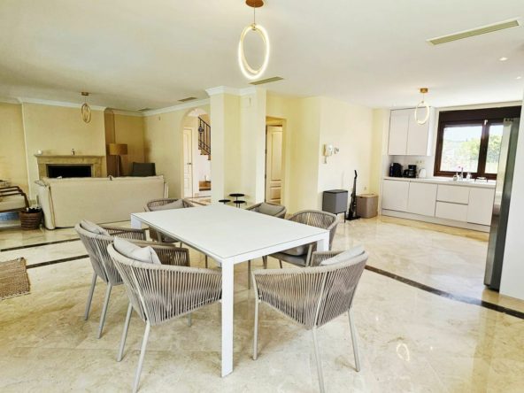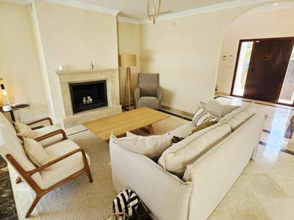 Welcome to this elegant and bright exclusive villa located in one of the quietest and most privileged areas of Estepona, in the heart of the Azata golf course. Upon entering the property, we are greeted by a large and welcoming entrance that leads directly to the spacious living and dining room with a fireplace, ideal for family gatherings or relaxing moments.