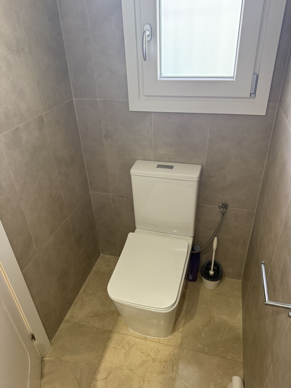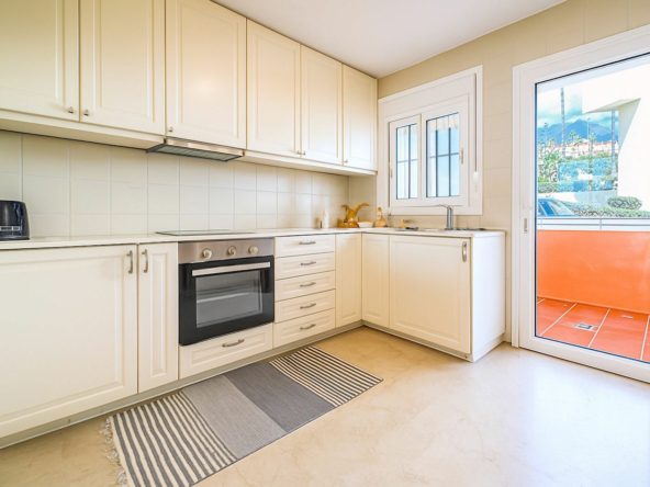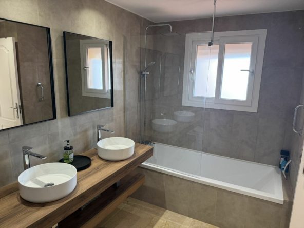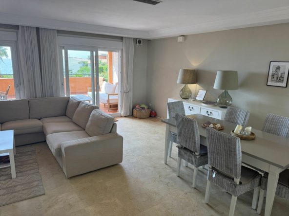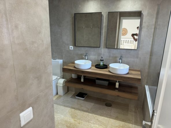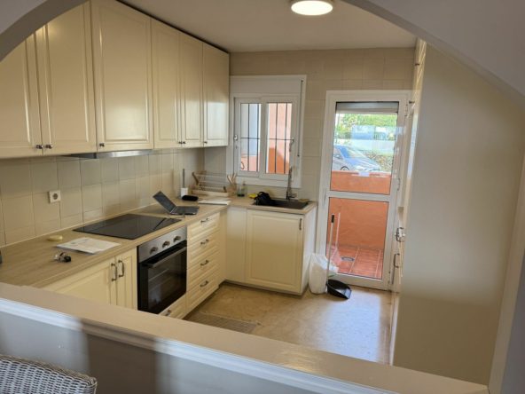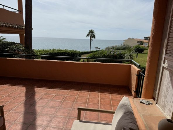 This is a fantastic property situated in Bermuda Beach, in an enviable front line beach position offering panoramic sea views. The property is currently being renovated to a very high standard including a new Italian kitchen, bathrooms in a modern contemporary style, new cream ceramic flooring throughout and new windows with electric blinds. The resulting effect is stunning and makes a perfect luxurious family home. The views can be appreciated from the moment you enter the property giving the “wow” factor. The kitchen and living room areas has been made into an Open-plan format making it much more spacious. There is ample space on the terrace which leads off from the living room – enough for sun-beds as well as a large dining table and chairs. Upstairs are the bedrooms with the Master bedroom having an ensuite bathroom and its own spacious balcony with those incredible sea views and two further guest bedrooms sharing a bathroom. There is a private space for the car and there is a supermarket and restaurants within easy walking distance and it is only 10 minutes by car to arrive at the town of Estepona. A great value for money property in an unbeatable location.