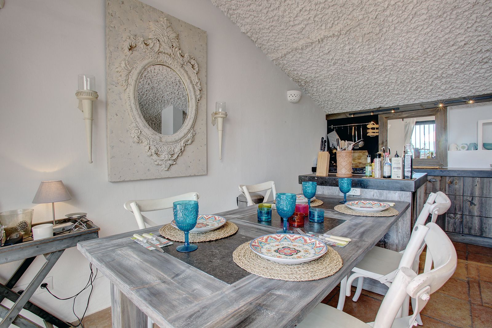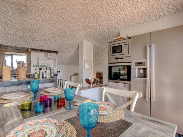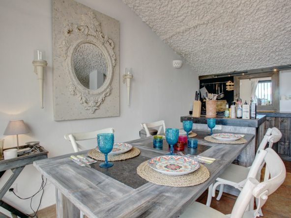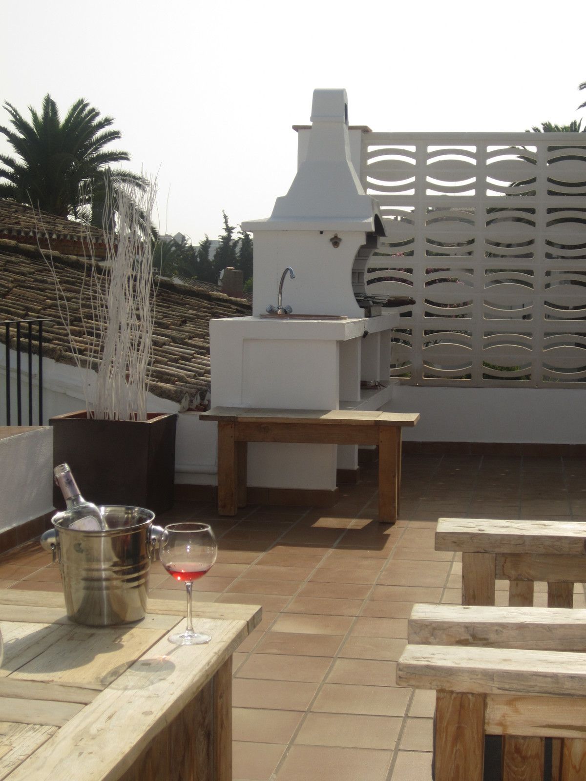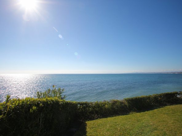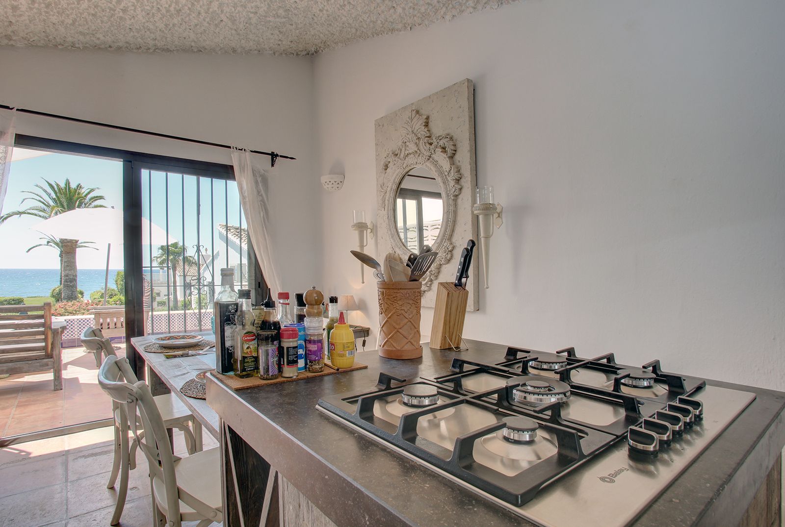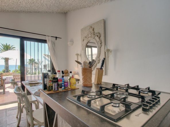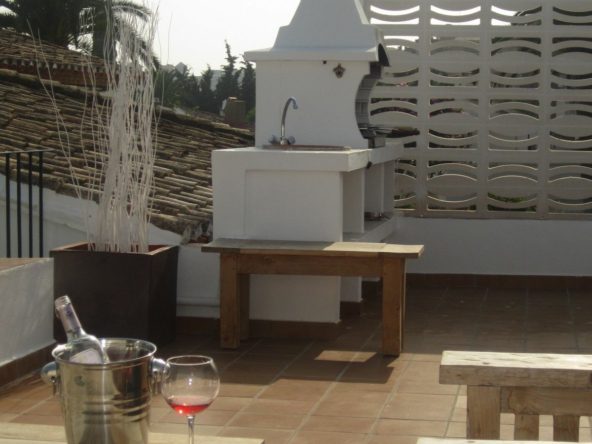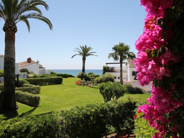 Very charming 3 bedroom / 2 bathroom townhouse with spectaculaire sea view in a securely gated beachfront resort with a large communal pool, subtropical gardens and direct access to the beach (only 50 steps to the beach!). The resort was built in 1969 and is located at the entrance (East) of Estepona, near the Palacio de Congresos and the large Supermercado Carrefour. The house has a private garden and a large terrace (50m2)with a lounge area, a built-in BBQ and a large dining table. From the terrace you have a wonderful view overlooking the Mediterranean sea. The fully fitted (new) kitchen is well equipped with American fridge/freezer, oven, microwave, 5 ring stove and dishwasher. The split level living-room has a seating area with a fire place and a flat screen TV, plus an office corner. All bedrooms have airconditioning and have direct access to the private garden. The Carrefour, several beachbars, a fresh bakery, a pharmacy, a hairdresser are all within short walking distance. Estepona old town is a 15 min walk. Popular places like Puro Beach club, Puerto Banus, Los Flamingos Golf Club, Marbella are all within a 5 – 15 min drive.