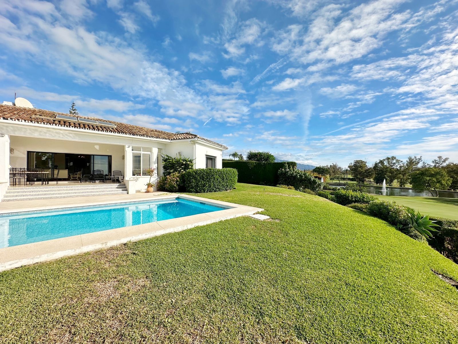 The villa features 4 bedrooms and 3 bathrooms, all on one floor, offering a bright, open layout with large windows that fill the home with light and provide **breathtaking views over the golf course, the lake, and the surrounding mature trees. Its southwest orientation ensures sunshine all day and unforgettable sunsets.
