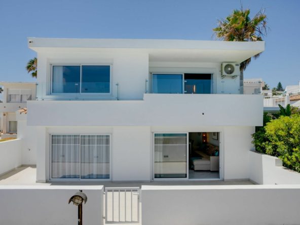 A beautifully renovated beachfront villa with perfect sea views. The house has been tastefully modernised to offer a large open plan living room with fully fitted modern kitchen, on the lower level is also one of the 3 bedrooms with bathroom.