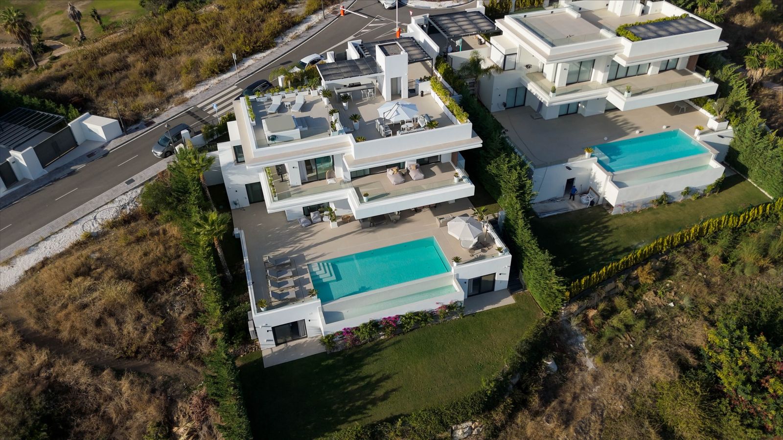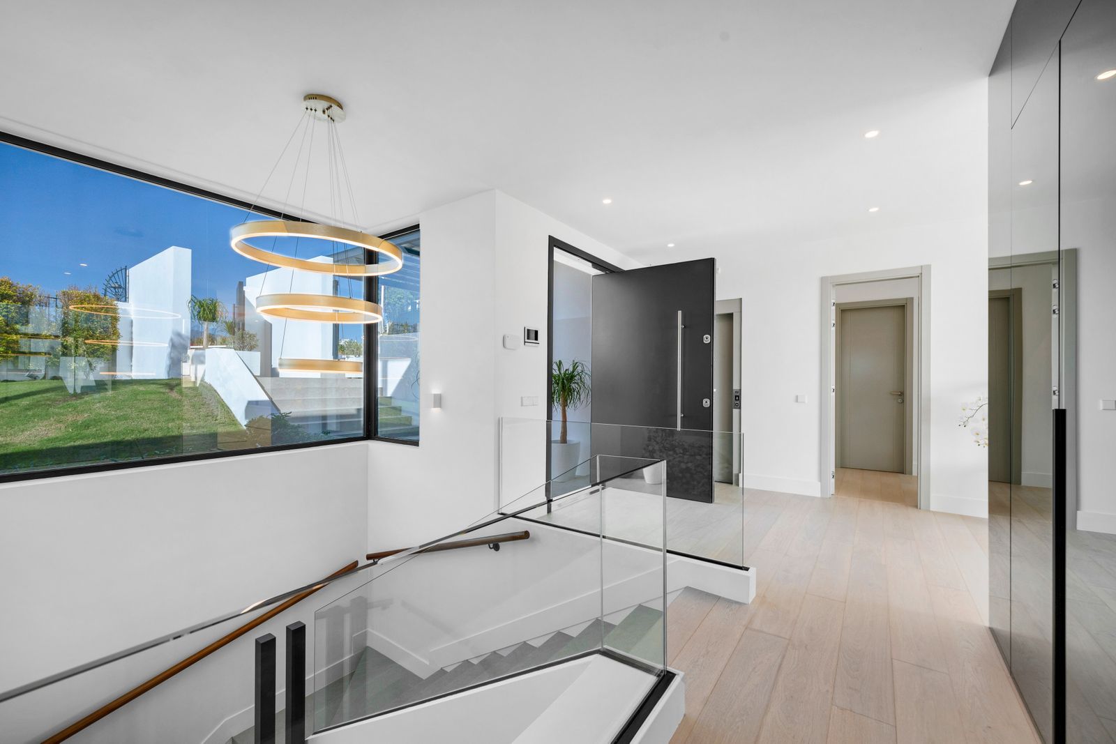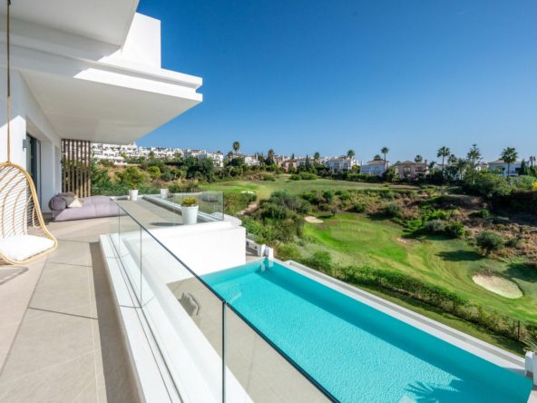 A private driveway leads to the top-floor entrance, where sweeping views of the Mediterranean and La Resina Golf Course immediately set the tone. Clean architectural lines, abundant natural light, and striking geometry create a stunning first impression.