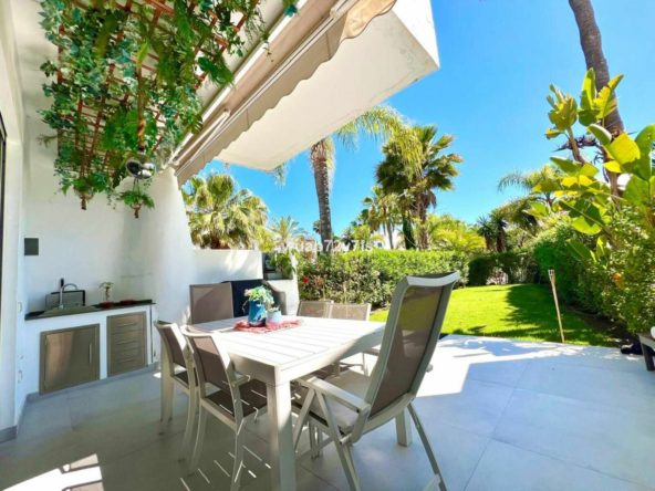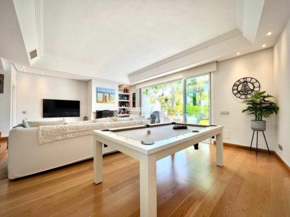 As you enter this home, you’ll find a convenient guest bathroom to the right. The open-plan kitchen and dining area lead down a few steps to the spacious living room and game area, which opens directly to the garden. Here, you’ll find a barbecue area, followed by a well-kept garden with direct access to the communal pools.