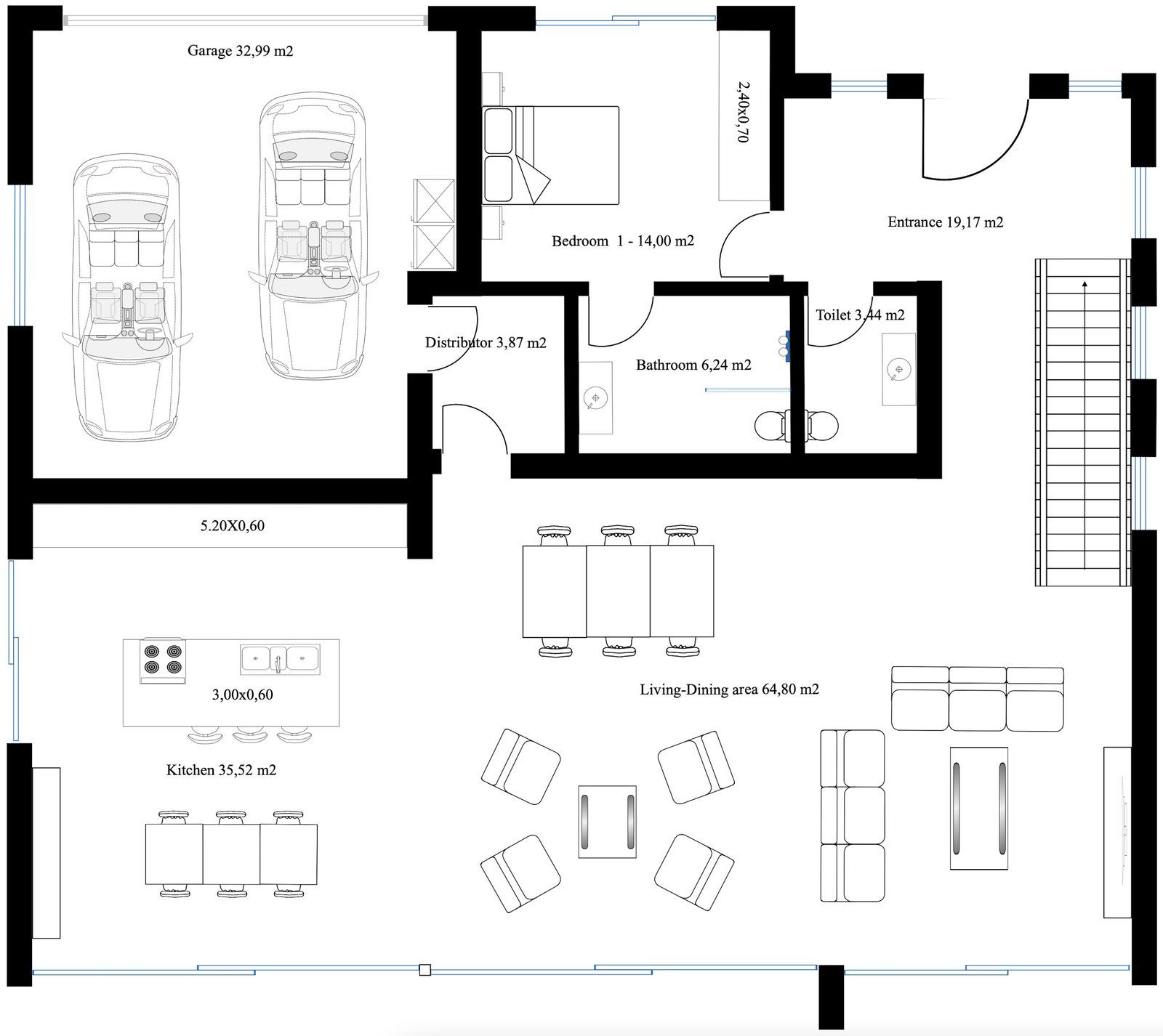 – Ceiling high and 1-meter-wide interior doors
