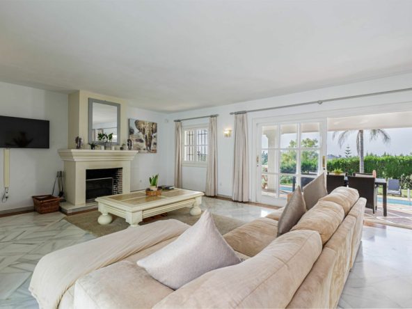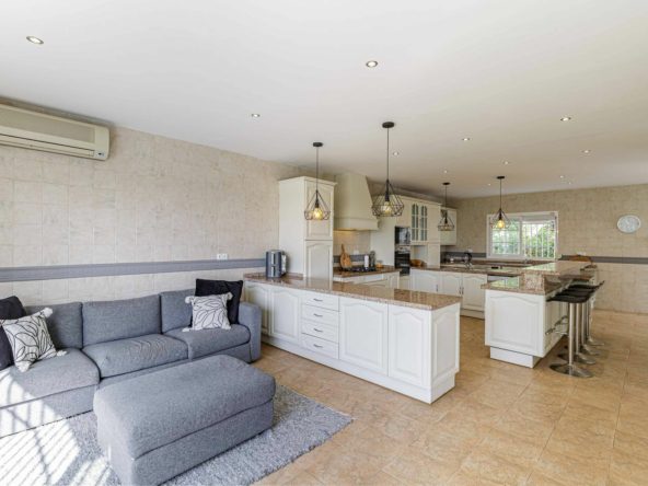 The villa currently features a two-level + lower ground layout with 5 bedrooms, 6 bathrooms, and an open-plan living and dining area with a fireplace and access to a shaded outdoor patio—ideal for al fresco dining. The huge kitchen is functional but offers scope for modernization.