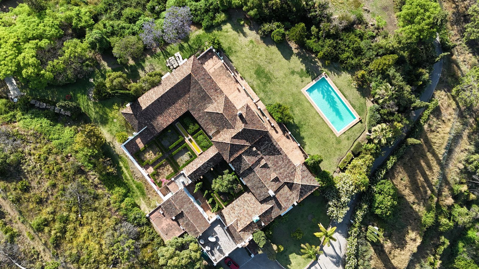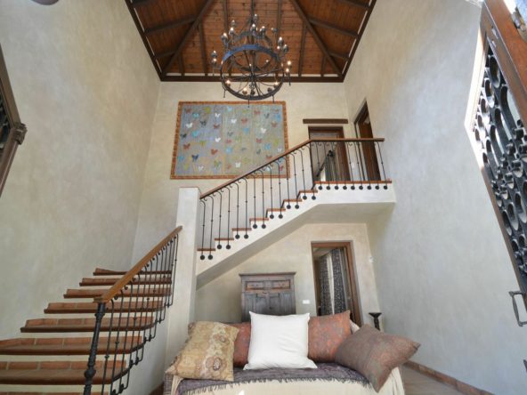 The actual distribution has, on the ground level: entrance gardened patios with water features and ancient olive trees, entrance hall with really high ceiling, wooden beams and a majestic staircase that leads up to a gorgeous master bedroom, dressing room and bathroom, plus like a sitting area overlooking the large living room. There is also a very spacious cinema room, a large dinning room with fire place and a large kitchen next to it. On the other side of the hall there are another three double bedroom suites. All this area access a large covered and open terrace which overlooks the garden, pool and forest. This is where the barbeque and outdoor dinning is.